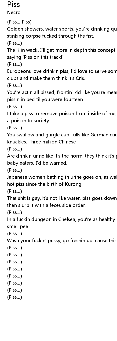 Golden showers, water sports, you're drinking quarts of piss, you'll end up a stinking corpse fucked through the fist. |
