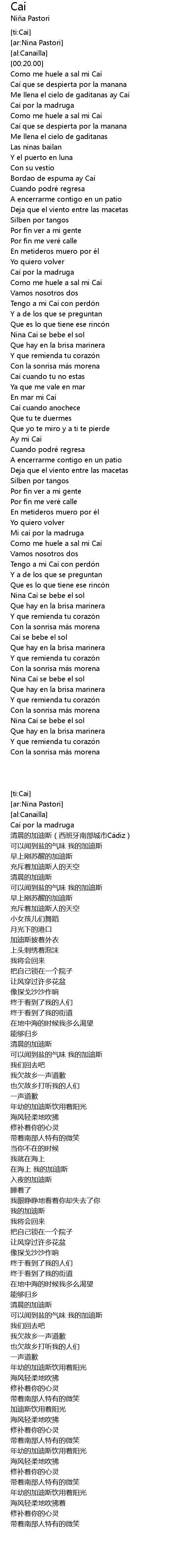 | [00:20.00] | Caí por la madruga 清晨的加迪斯(西班牙南部城市Cádiz) |