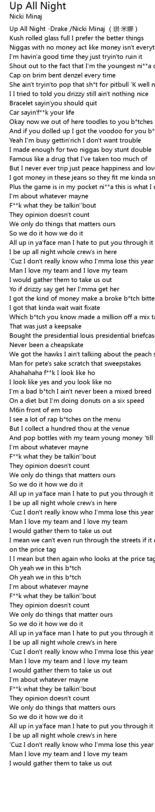 | [00:00.00] | Up All Night -Drake /Nicki Minaj (琪·米娜) |