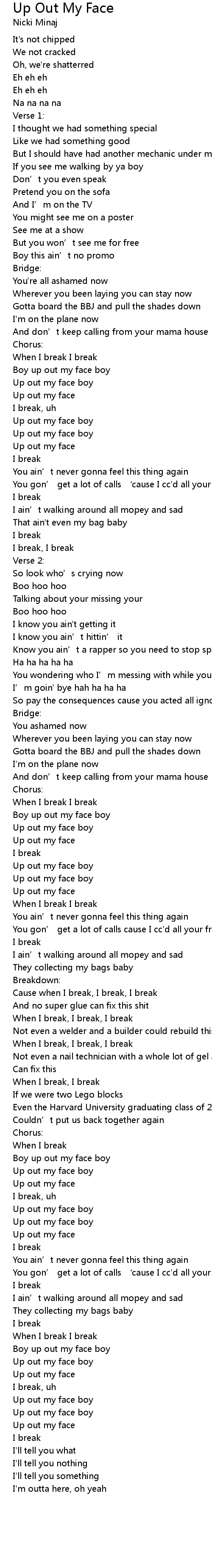 | 歌曲 | Up Out My Face |