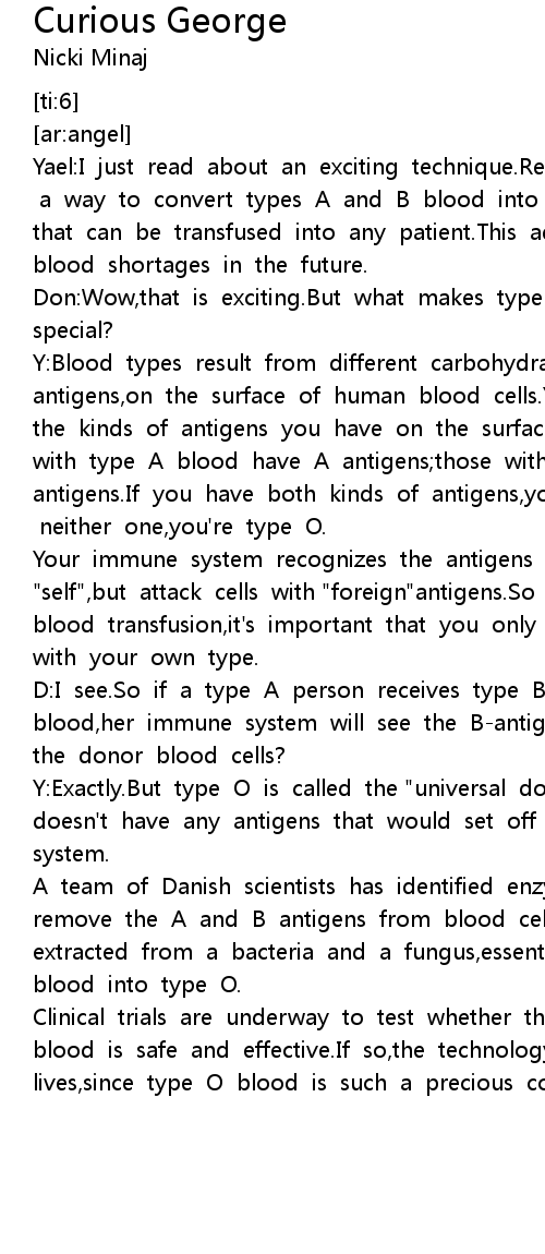 Y:Exactly.But type O is called the "universal donor"since it doesn't have any antigens that would set off the body's defense system. |