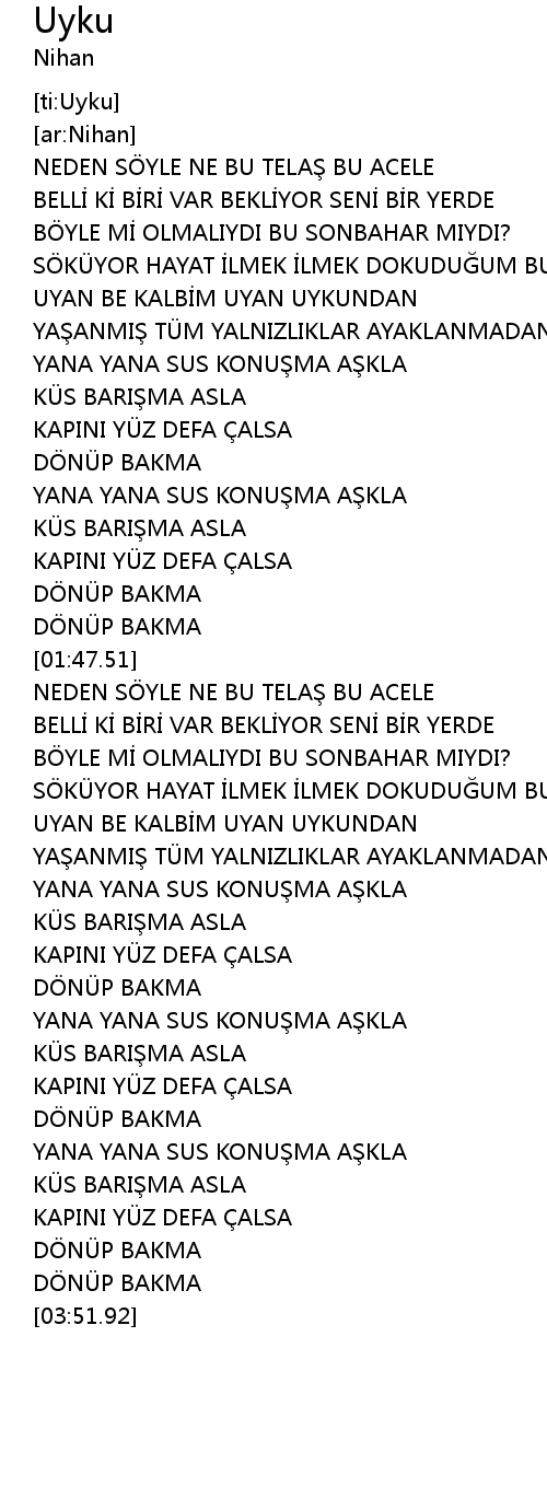 | [02:33.91] | UYAN BE KALBİM UYAN UYKUNDAN |