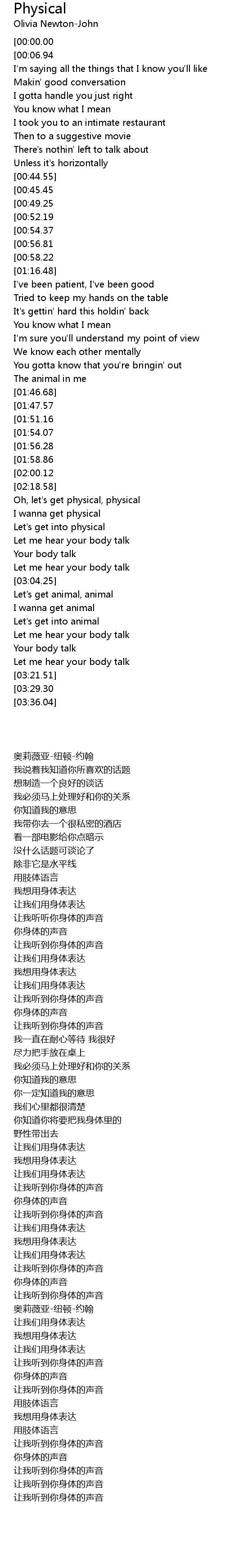 | [02:19.52][00:00.00] | -= Olivia Newton-John 《 Physical 》 =- |