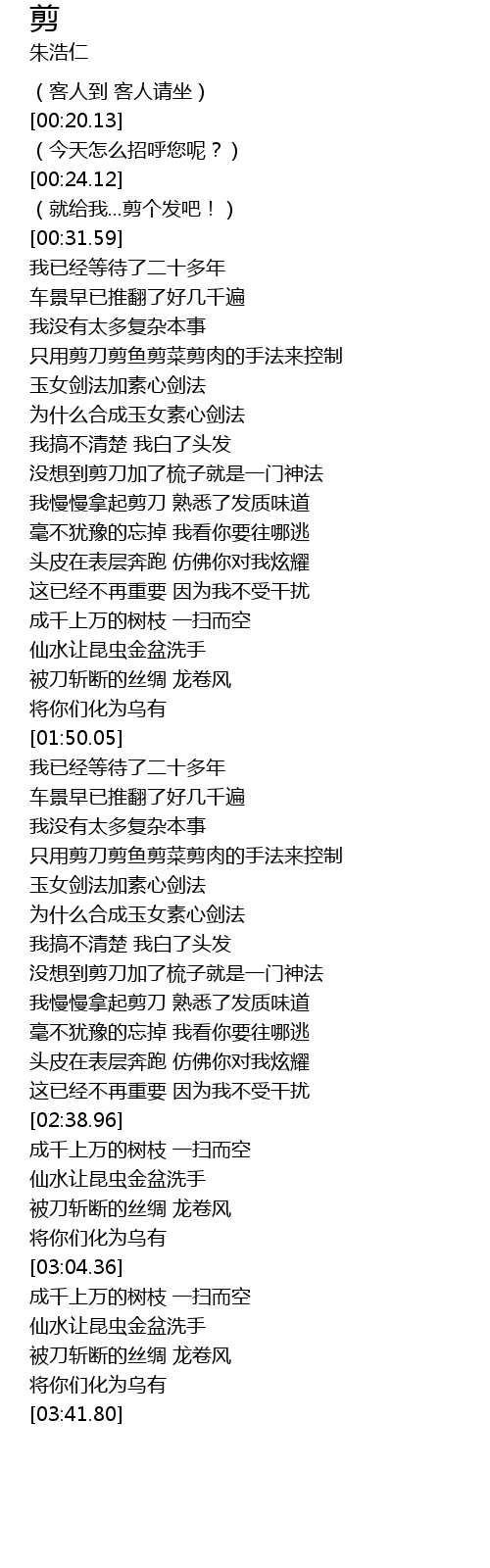 | [02:20.50] | 我慢慢拿起剪刀 熟悉了发质味道 |