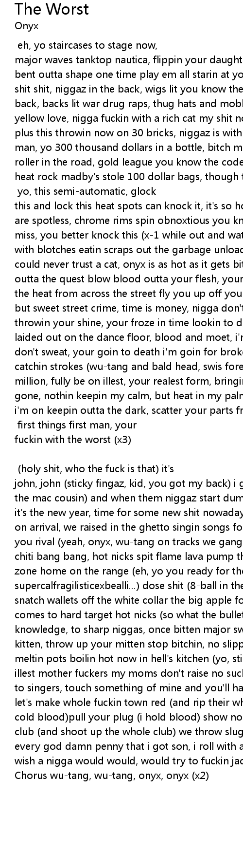 wu-tang, wu-tang, onyx, onyx (x3) [Raekwon] eh, yo staircases to stage now, major waves tanktop nautica, flippin your daughter 30 ways yeah, who want mine, bent outta shape one time play em all starin at your beautiful sunshine watch my shit shit, niggaz in the back, wigs lit you know the stats god, niggaz in the back, backs lit war drug raps, thug hats and mobb hats spit on that cat, this yellow love, nigga fuckin with a rich cat my shit now 5 feet 6, with a crisp hat plus this throwin now on 30 bricks, niggaz is with that yo, fedrados rock my man, yo 300 thousand dollars in a bottle, bitch mad as hollow my techinique, roller in the road, gold league you know the code read, suitcase money, stole heat rock madby's stole 100 dollar bags, though that nigga grabbed me, gamin himself like milton bradley [Fredro Starr, (X-1)] yo, this semi-automatic, glock this and lock this heat spots can knock it, it's so hot chicks is topless rims are spotless, chrome rims spin obnoxtious you knock this, bust a shot don't miss, you better knock this (x-1 while out and watch this til your eyes turn red with blotches eatin scraps out the garbage unload a cartridge and bust a cap x could never trust a cat, onyx is as hot as it gets bitches fuckin for free, is outta the quest blow blood outta your flesh, your body outta your vest) i cross the heat from across the street fly you up off your feet, you die leaving short but sweet street crime, time is money, nigga don't waist mine dispose my 9, throwin your shine, your froze in time lookin to death, holdin your breath, laided out on the dance floor, blood and moet, i'm blowin your set trick 20 g's, don't sweat, your goin to death i'm goin for broke, i'm blowin out smoke, your catchin strokes (wu-tang and bald head, swis foreheads, leavin you all red x million, fully be on illest, your realest form, bringin the storm for seein you gone, nothin keepin my calm, but heat in my palm sleepin i'm gone, you see what i'm on keepin outta the dark, scatter your parts from here to battery parts) |