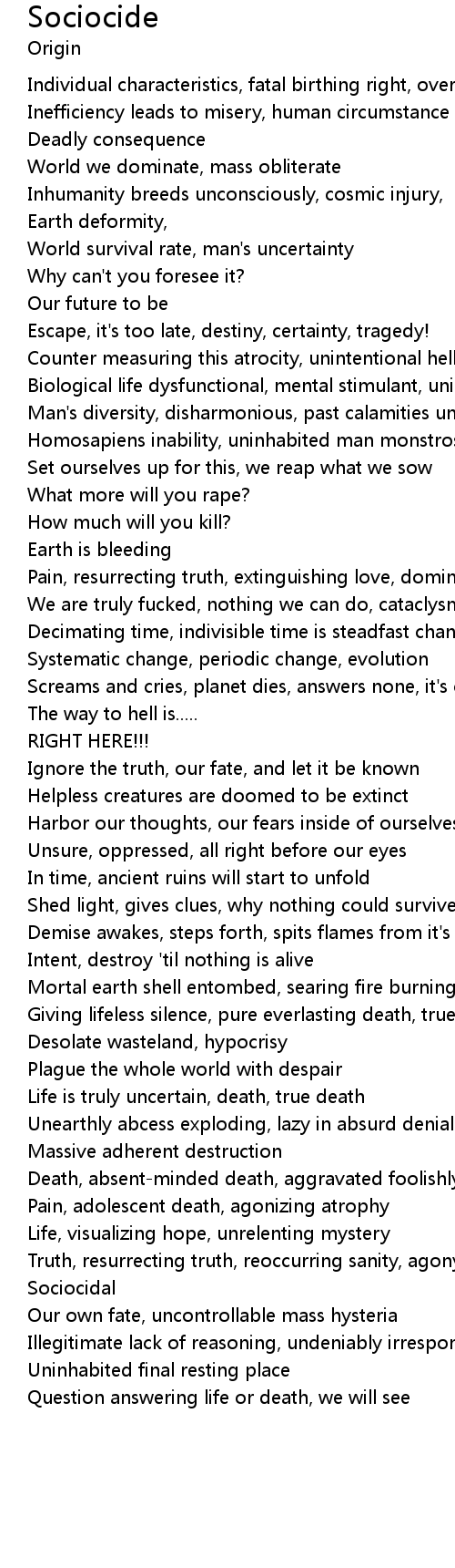 | Screams and cries, planet dies, answers none, it's our fault | |