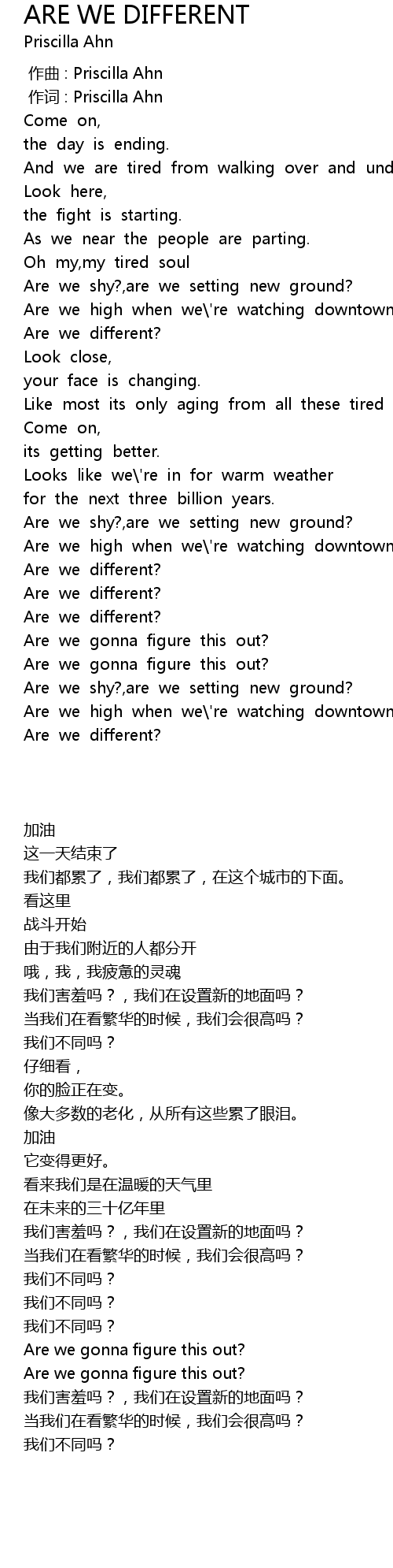 | [00:01.00] | 作词 : Priscilla Ahn |