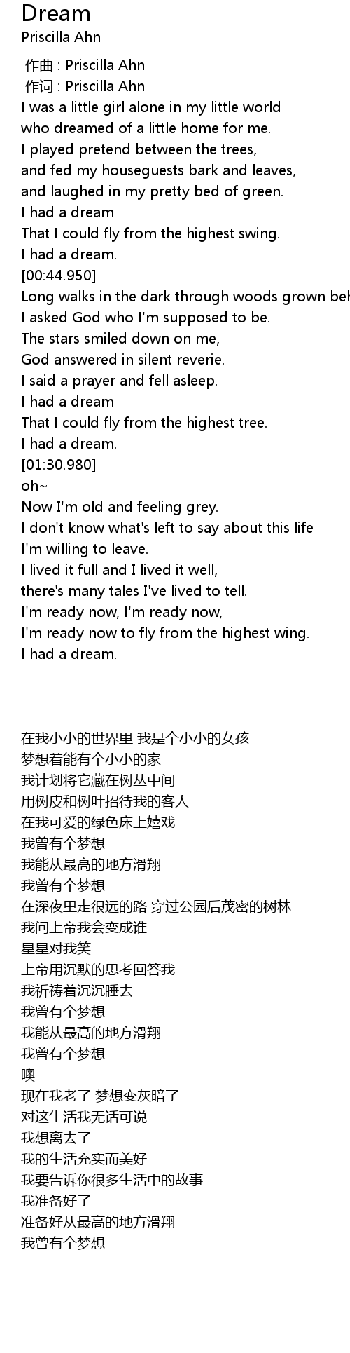 | [00:01.00] | 作词 : Priscilla Ahn |