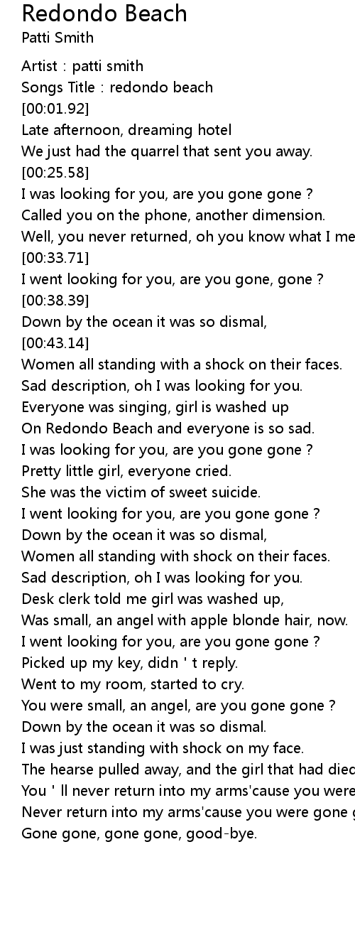 | [00:47.89] | On Redondo Beach and everyone is so sad. |