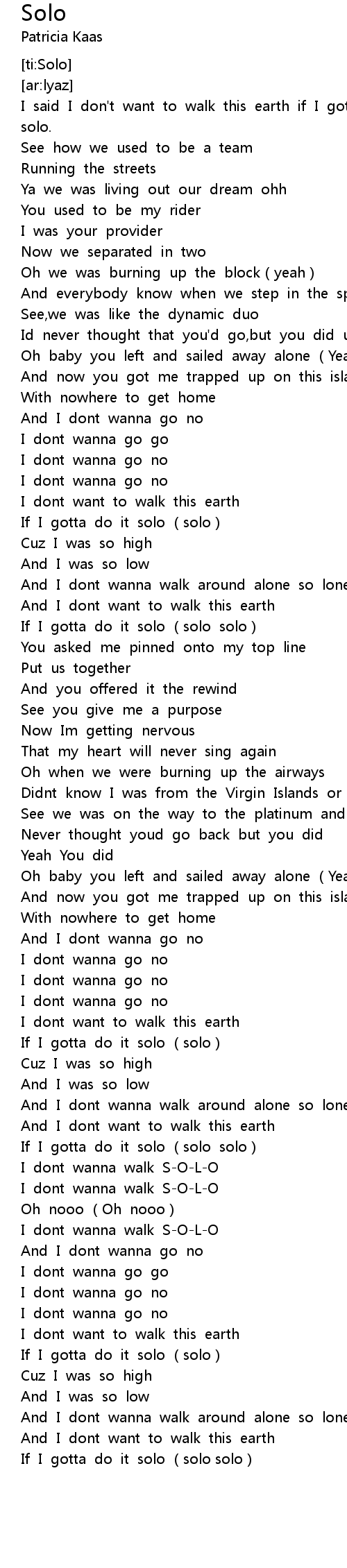 | [02:39.267] | I dont wanna walk S-O-L-O |