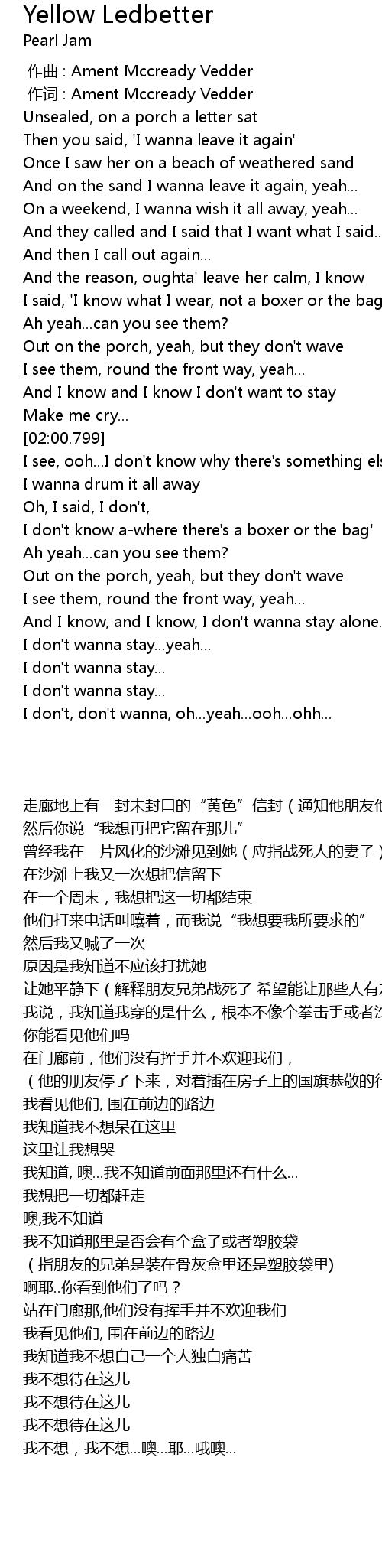 | [00:01.00] | 作词 : Ament Mccready Vedder |