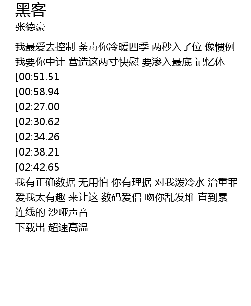 | [03:22.42][02:27.00][01:06.25] | 连线的沙哑声音 黑客在狂号 |
