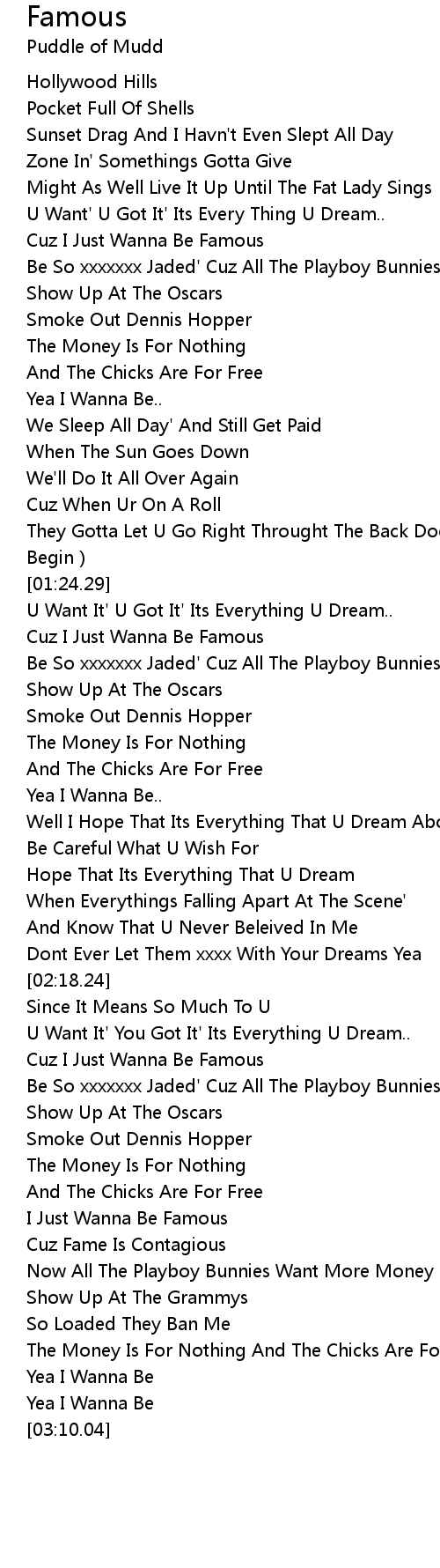 | [02:31.10] | Be So xxxxxxx Jaded' Cuz All The Playboy Bunnies Take My Money From Me |