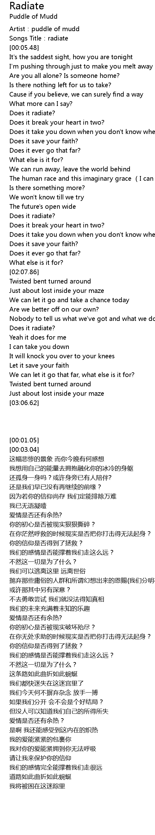 | [00:01.05] | Artist:puddle of mudd |