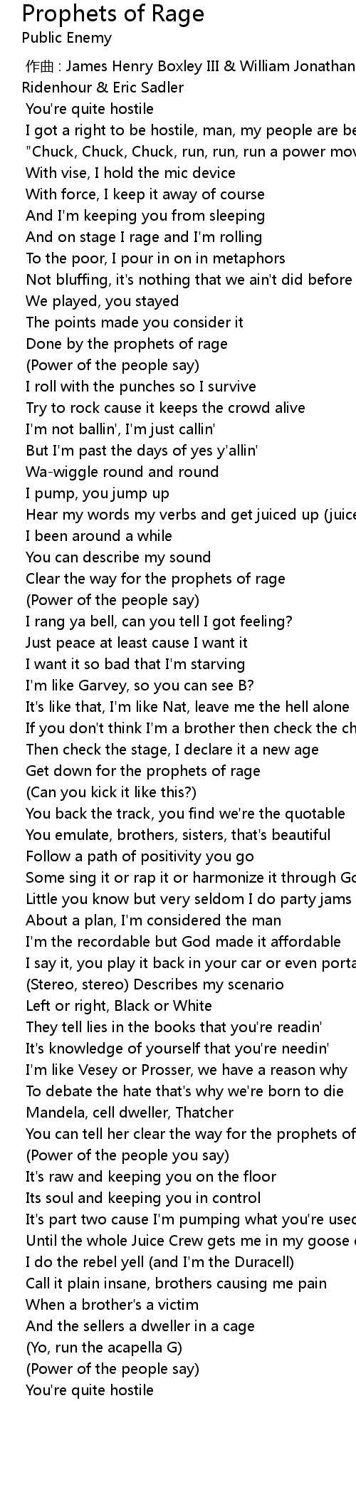 | [02:25.145] | You can tell her clear the way for the prophets of rage |