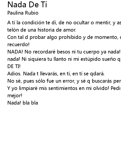 | NADA! No recordaré besos ni tu cuerpo ya nada! Será hueco vací o y no quedará nada! Ni siquiera tu llanto ni mi estú pido sue o que tení a contigo! NADA NADA DE TI! | |