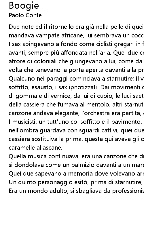 | I sax spingevano a fondo come ciclisti gregari in fuga e la canzone andava avanti, sempre più affondata nell' aria. Quei due continuavano da lei saliva afrore di coloniali che giungevano a lui, come da una di quelle drogherie di una volta che tenevano la porta aperta davanti alla primavera. | |