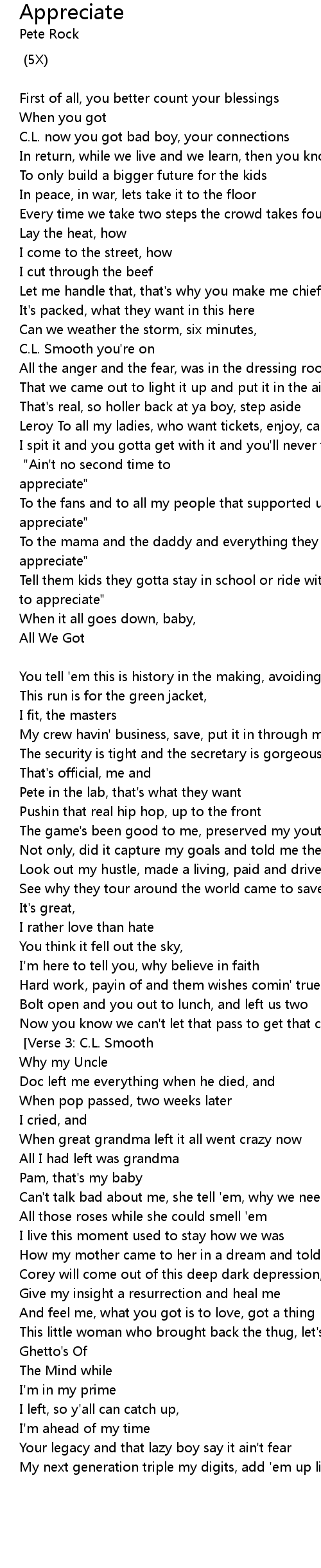 * * first single; send corrections to the typist [Intro: Children singing] (5X) "Ain't no second time to appreciate" [Verse 1: C.L. Smooth] |