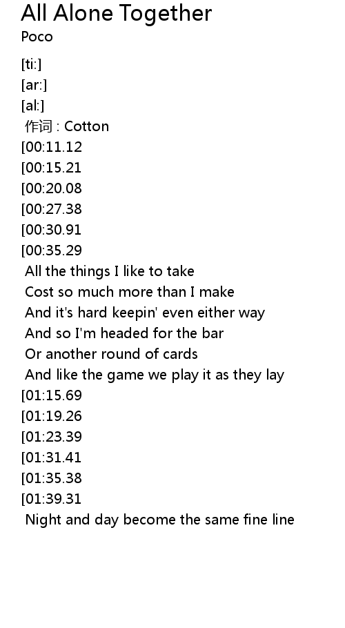 | [02:32.30][01:15.69] | And we' re all alone together |