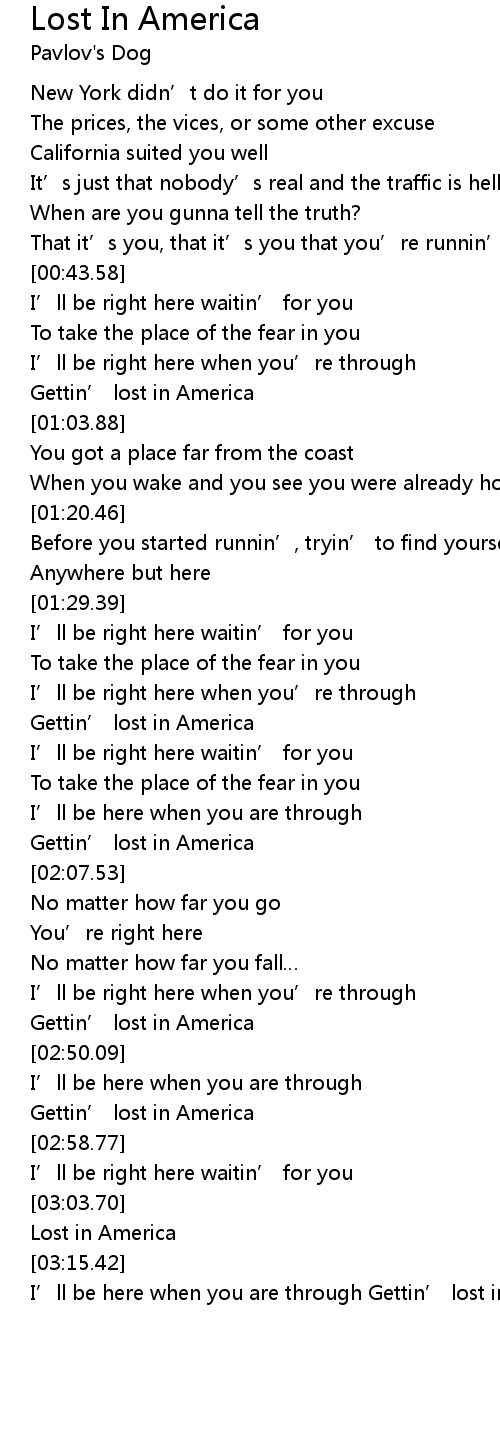 | [03:16.80] | I’ll be here when you are through Gettin’ lost in America |