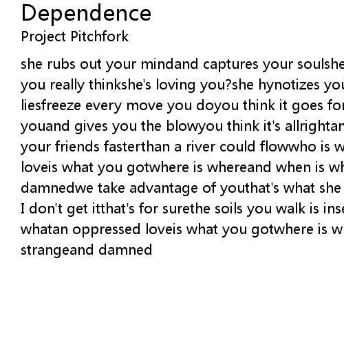 she rubs out your mindand captures your soulshe rapes your conscienceand then you really thinkshe's loving you?she hynotizes your eyesand pump you up with liesfreeze every move you doyou think it goes forwardbut no way to goshe got youand gives you the blowyou think it's allrightand you don't even knowyou left your friends fasterthan a river could flowwho is whowhat is whatan oppressed loveis what you gotwhere is whereand when is whensubjugation is strangeand damnedwe take advantage of youthat's what she always says |