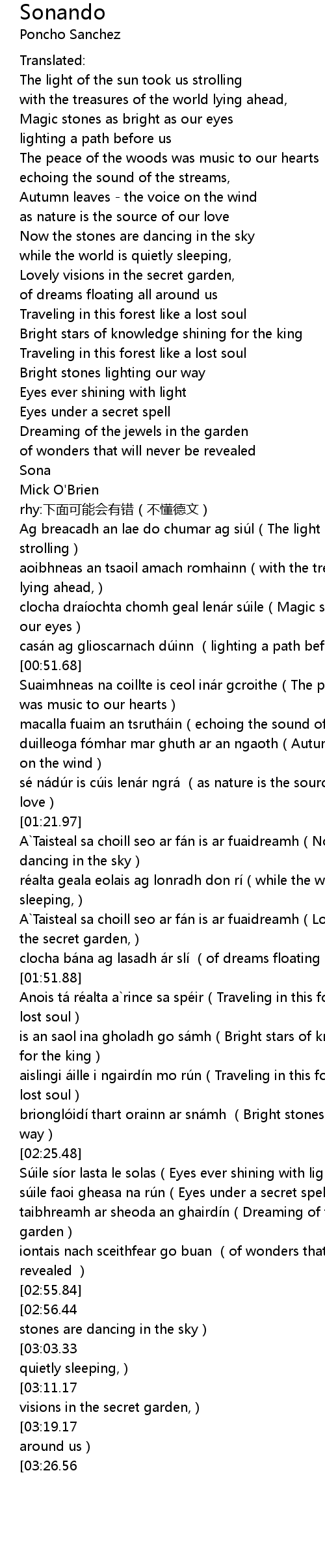 | [03:43.15][03:11.17] | A Taisteal sa choill seo ar fá n is ar fuaidreamh Lovely visions in the secret garden, |