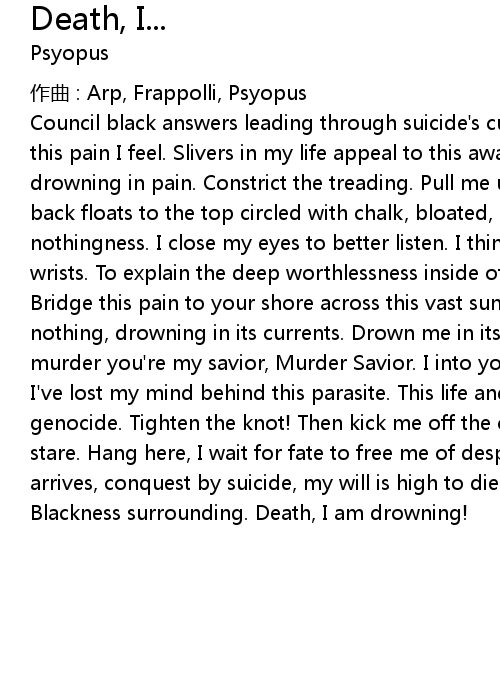 | Council black answers leading through suicide' s curtain. Darkness, answer for this pain I feel. Slivers in my life appeal to this awakening Death, I am drowning in pain. Constrict the treading. Pull me underwater deeper until my back floats to the top circled with chalk, bloated, and drifting along into nothingness. I close my eyes to better listen. I think I hear you whisper, Slit wrists. To explain the deep worthlessness inside of my time spent here waiting. Bridge this pain to your shore across this vast sunless funeral ocean of nothing, drowning in its currents. Drown me in its currents. Murder Savior, murder you' re my savior, Murder Savior. I into you confide intimate suicide I' ve lost my mind behind this parasite. This life and I collide into thought genocide. Tighten the knot! Then kick me off the chair a dangled sightless stare. Hang here, I wait for fate to free me of despair. My council soon arrives, conquest by suicide, my will is high to die, these bounds untied. Blackness surrounding. Death, I am drowning! |