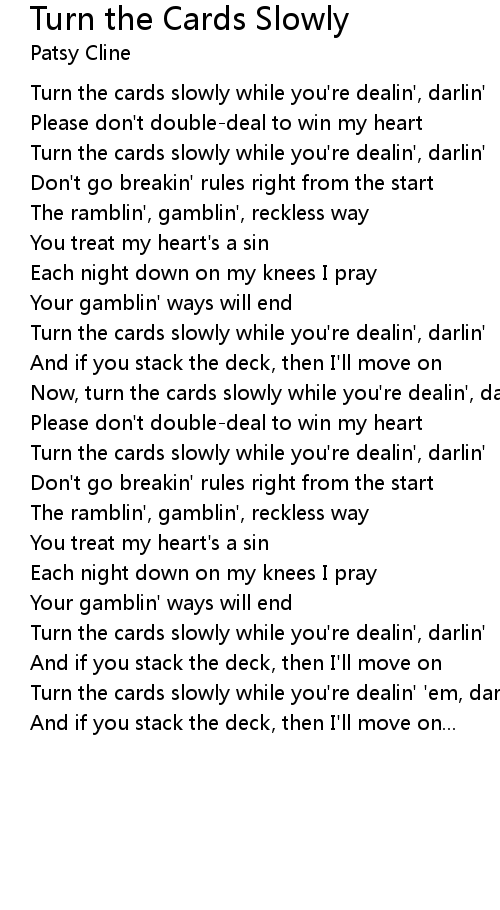 Now, turn the cards slowly while you're dealin', darlin' |
