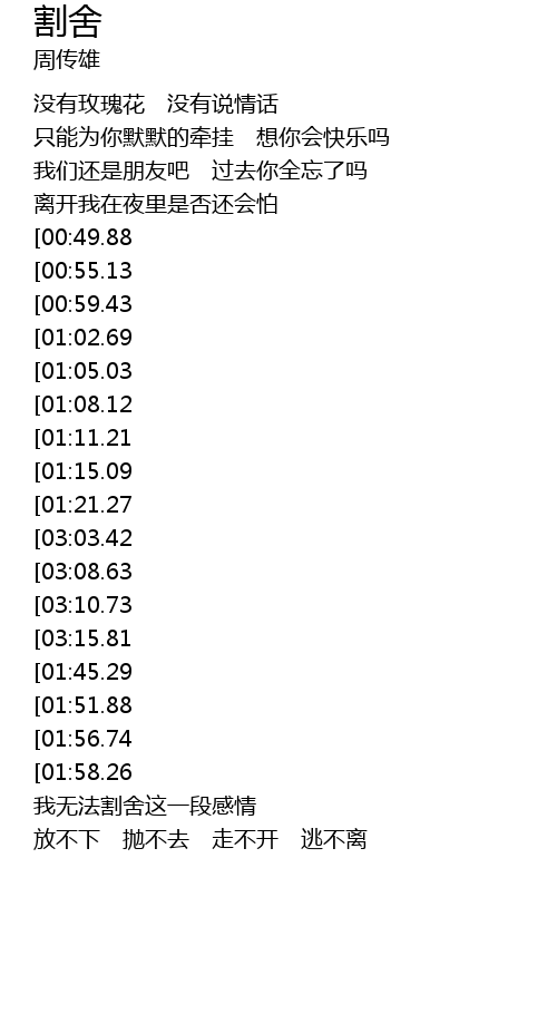 | [02:23.27][00:49.88] | 何苦再挣扎 别再想你吧 |