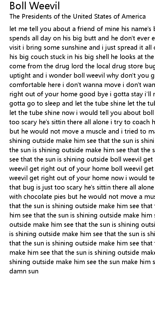 let me tell you about a friend of mine his name's boll weevil check him out spends all day on his big butt and he don't ever ever get outside i come to visit i bring some sunshine and i just spread it all over the fire he's stuck on his big couch stuck in his big shell he looks at the tv and he's all right i come from the drug lord the local drug store bug is a fly baby he's never uptight and i wonder boll weevil why don't you get out of your home he said i'm comfortable here i don't wanna move i don't wanna leave i said boll weevil get right out of your home good bye i gotta stay i'll move some other day bye bye gotta go to sleep and let the tube shine let the tube shine let the tube shine let the tube shine now i would tell you about boll weevil but that bug is just too scary he's sittin there all alone i try to coach him out with chocolate pies but he would not move a muscle and i tried to make him see that the sun is shining outside make him see that the sun is shining outside make him see that the sun is shining outside make him see that the sun is shining outside make him see that the sun is shining outside boll weevil get right out of your home boll weevil get right out of your home boll weevil get right out of your home boll weevil get right out of your home now i would tell you about boll weevil but that bug is just too scary he's sittin there all alone i try to coach him out with chocolate pies but he would not move a muscle and i tried to make him see that the sun is shining outside make him see that the sun is shining out make him see that the sun is shining outside make him see that the sun is shining outside make him see that the sun is shining outside make him see that the sun is shining outside make him see that the sun is shining outside make him see that the sun is shining outside make him see that the sun is shining outside make him see that the sun is shining outside make him see that the sun is shining outside make him see the sun make him see the sun make him see the god damn sun |