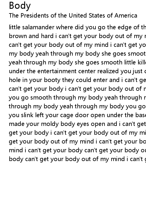 little salamander where did you go the edge of the yard i found you you know all brown and hard i can't get your body out of my mind i can't get your body i can't get your body out of my mind i can't get your body she goes smooth through my body yeah through my body she goes smooth she goes smooth through my body yeah through my body she goes smooth little killer froggy where did you hop under the entertainment center realized you just couldn't stop the worms found a hole in your booty they could enter and i can't get your body out of my mind i can't get your body i can't get your body out of my mind i can't get your body you go smooth through my body yeah through my body you go smooth you go smooth through my body yeah through my body you go smooth hey little lizard where did you slink left your cage door open under the basement sink the drippin' water made your moldy body eyes open and i can't get your body out of my mind i can't get your body i can't get your body out of my mind i can't get your body can't get your body out of my mind i can't get your body can't get your body out of my mind i can't get your body can't get your body out of my mind i can't get your body can't get your body out of my mind i can't get your body