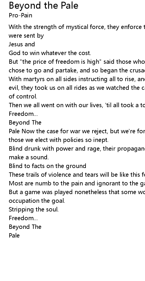 Pale Now the case for war we reject, but we're forced to accept and trust in those we elect with policies so inept. |