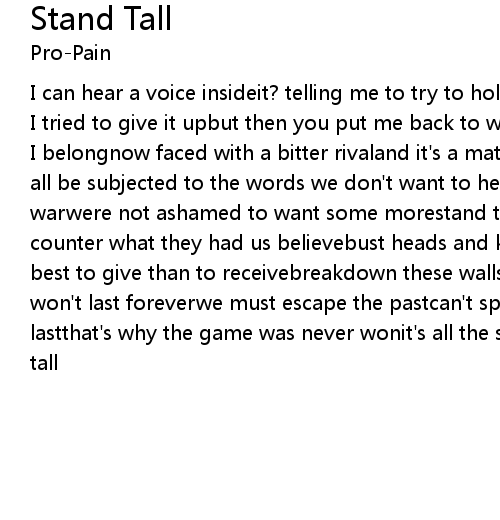 I belongnow faced with a bitter rivaland it's a matter of street survivalwe must all be subjected to the words we don't want to hearit was a game, now it's a warwere not ashamed to want some morestand talltime to prepare the massesto counter what they had us believebust heads and kick some assescause it's the best to give than to receivebreakdown these walls togethercause silly words won't last foreverwe must escape the pastcan't spin our wheels to make it lastthat's why the game was never wonit's all the same when said and donestand tall |
