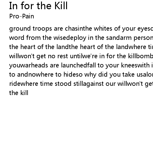 ground troops are chasinthe whites of your eyesclose all the doors andtake a word from the wisedeploy in the sandarm personnel anddrive like a knifethrough the heart of the landthe heart of the landwhere time stood stillagainst our willwon't get no rest untilwe're in for the killbombs over head will make youwarheads are launchedfall to your kneeswith infectious diseaseno place to run to andnowhere to hideso why did you take usalong for the ride?along for the ridewhere time stood stillagainst our willwon't get no rest untilwe're in for the kill |