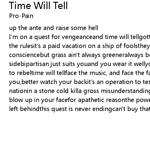I'm on a quest for vengeanceand time will tellgotta break the silenceand bend the rulesit's a paid vacation on a ship of foolsthey say to let your consciencebut grass ain't always greeneralways be your guideon the other sidebipartisan just suits youand you wear it wellyour attitude has givenreason to rebeltime will tellface the music, and face the factthat we're comin at you,better watch your backit's an operation to test the willgonna brief the nationin a stone cold killa gross misunderstandingseems to have taken placeto blow up in your facefor apathetic reasonthe powertrip has endedso leave what's left behindthis quest is never endingcan't buy that peace of mindtime will tell |