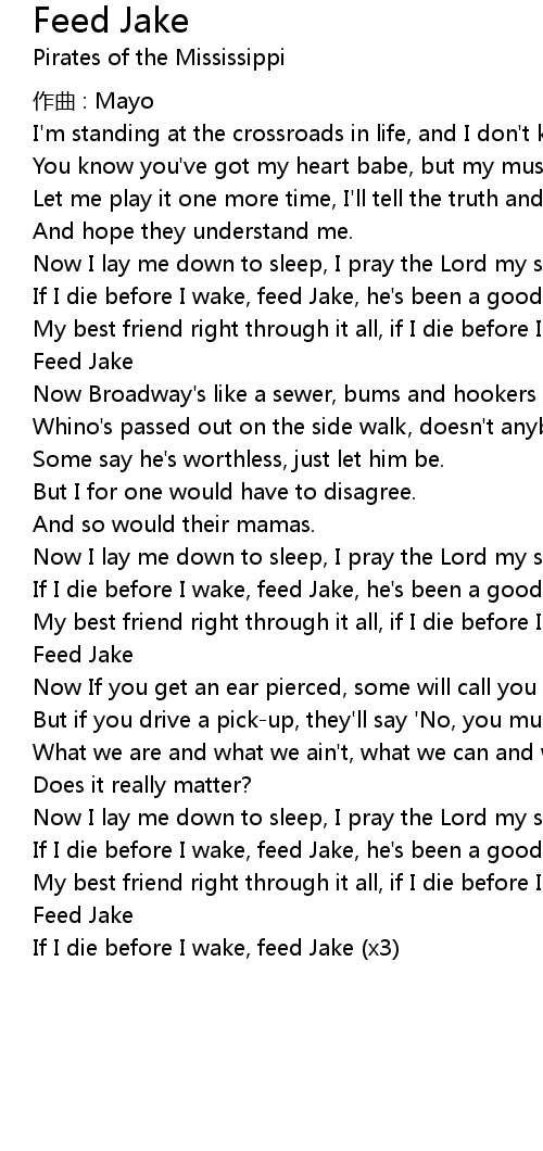 | If I die before I wake, feed Jake, he's been a good dog, | |