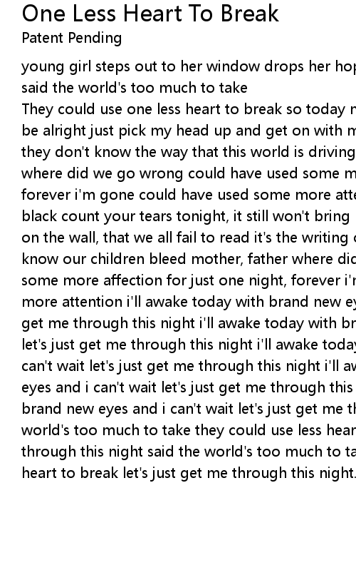 They could use one less heart to break so today might be my last they said i'll be alright just pick my head up and get on with my day they don't know the pain they don't know the way that this world is driving me insane mother, father where did we go wrong could have used some more affection for just one night, forever i'm gone could have used some more attention the whole world fades to black count your tears tonight, it still won't bring her back it's the writing on the wall, that we all fail to read it's the writing on the wall, that lets us know our children bleed mother, father where did we go wrong could have used some more affection for just one night, forever i'm gone could have used some more attention i'll awake today with brand new eyes and i can't wait let's just get me through this night i'll awake today with brand new eyes and i can't wait let's just get me through this night i'll awake today with brand new eyes and i can't wait let's just get me through this night i'll awake today with brand new eyes and i can't wait let's just get me through this night i'll awake today with brand new eyes and i can't wait let's just get me through this night said the world's too much to take they could use less heart to break let's just get me through this night said the world's too much to take they could use one less heart to break let's just get me through this night... |