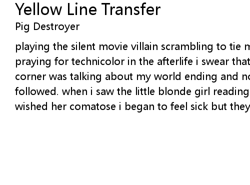 | playing the silent movie villain scrambling to tie myself to train tracks. praying for technicolor in the afterlife i swear that eccentric on the street corner was talking about my world ending and now i feel like i am being followed. when i saw the little blonde girl reading the book on horses and i wished her comatose i began to feel sick but they tell me that i am better now. |