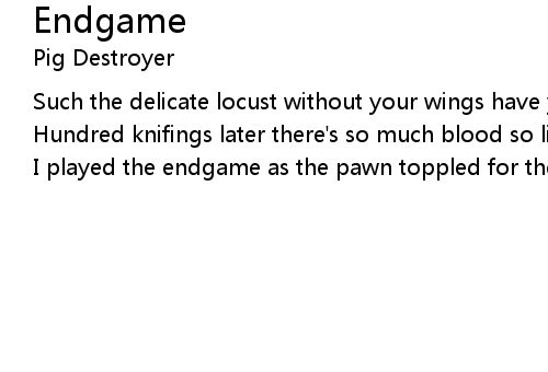 | Hundred knifings later there's so much blood so little of anything else for you | |