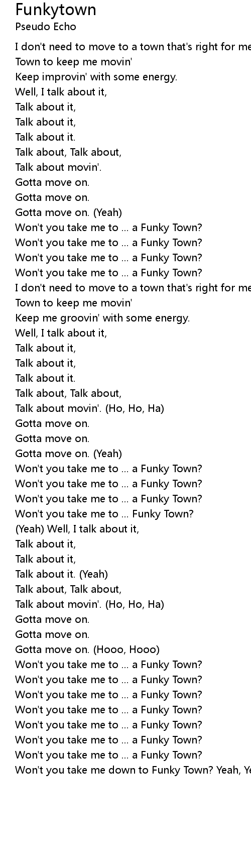 Won't you take me down to Funky Town? Yeah, Yeah (C'mon)