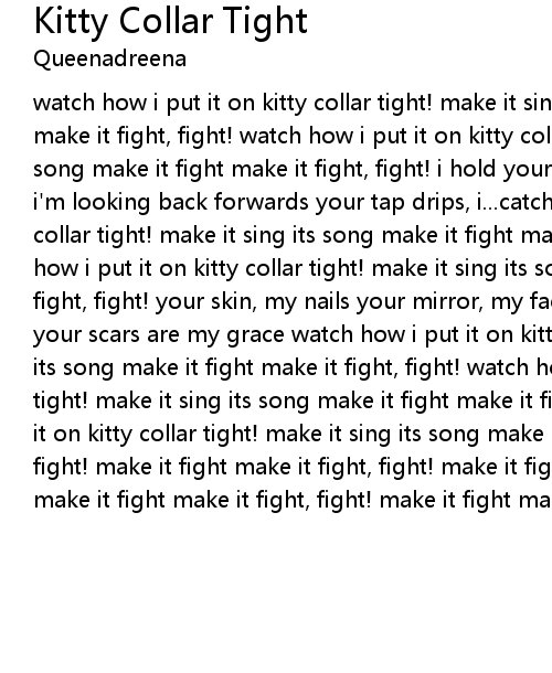 watch how i put it on kitty collar tight! make it sing its song make it fight make it fight, fight! watch how i put it on kitty collar tight! make it sing its song make it fight make it fight, fight! i hold your history and i kiss the map i'm looking back forwards your tap drips, i...catch watch how i put it on kitty collar tight! make it sing its song make it fight make it fight, fight! watch how i put it on kitty collar tight! make it sing its song make it fight make it fight, fight! your skin, my nails your mirror, my face your skin impaled for your scars are my grace watch how i put it on kitty collar tight! make it sing its song make it fight make it fight, fight! watch how i put it on kitty collar tight! make it sing its song make it fight make it fight, fight! watch how i put it on kitty collar tight! make it sing its song make it fight make it fight, fight! make it fight make it fight, fight! make it fight make it fight, fight! make it fight make it fight, fight! make it fight make it fight, fight! |
