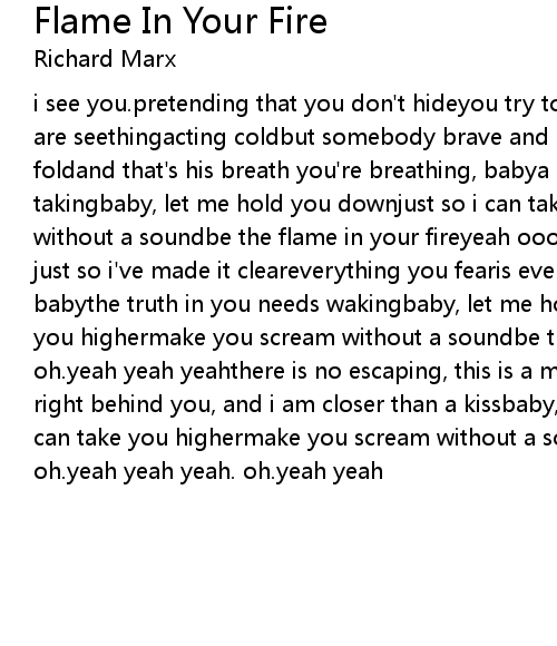 i see you.pretending that you don't hideyou try to let love slidebut inside you are seethingacting coldbut somebody brave and boldis chas in' you from the foldand that's his breath you're breathing, babya chance made just for takingbaby, let me hold you downjust so i can take you highermake you scream without a soundbe the flame in your fireyeah oooh. oh.yeah yeah yeahi am hereand just so i've made it cleareverything you fearis everything you're needing, babythe truth in you needs wakingbaby, let me hold you downjust so i can take you highermake you scream without a soundbe the flame in your fireyeah oooh. oh.yeah yeah yeahthere is no escaping, this is a moment i won't let you missi am right behind you, and i am closer than a kissbaby, let me hold you downjust so i can take you highermake you scream without a soundbe the flame in your fire. oh.yeah yeah yeah. oh.yeah yeah |