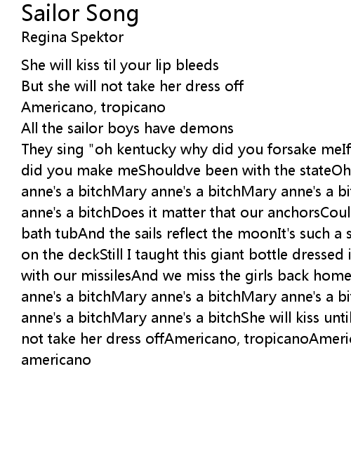 They sing "oh kentucky why did you forsake meIf I was meant to sail the seaWhy did you make meShouldve been with the stateOh stateCause mary anne's a bitchMary anne's a bitchMary anne's a bitchMary anne's a bitchMary anne's a bitchMary anne's a bitchDoes it matter that our anchorsCouldn't even reach the bottomOf a bath tubAnd the sails reflect the moonIt's such a strange jobPlaying black jack on the deckStill I taught this giant bottle dressed in whiteWe quitely huddle with our missilesAnd we miss the girls back homeOh home sweet homeCause mary anne's a bitchMary anne's a bitchMary anne's a bitchMary anne's a bitchMary anne's a bitchMary anne's a bitchShe will kiss until your lip bleedsBut she will not take her dress offAmericano, tropicanoAmericano, tropicanoAmericano, americano |