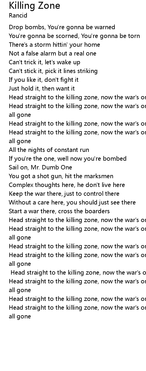 Head straight to the killing zone, now the war's on, holes in the ozone, we're all gone |
