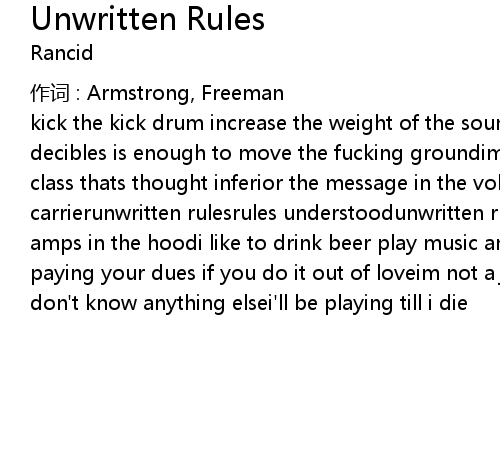 | kick the kick drum increase the weight of the soundthe dialog of maximum decibles is enough to move the fucking groundim gonna amplify the rage of a class thats thought inferior the message in the volumethis song a carrierunwritten rulesrules understoodunwritten rulesboomin out the speakers and amps in the hoodi like to drink beer play music and go to showsits not about paying your dues if you do it out of loveim not a jaded junkie running dryi don' t know anything elsei' ll be playing till i die |