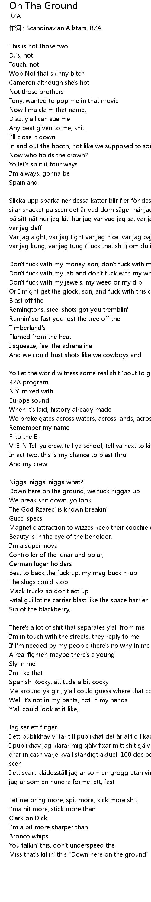 | Var jag aight, var jag tight var jag nice, var jag bajs var jag ingenting alls var jag kung, var jag tung Fuck that shit om du inte diggar min stil man Nigga, fuck that shit RZA | |