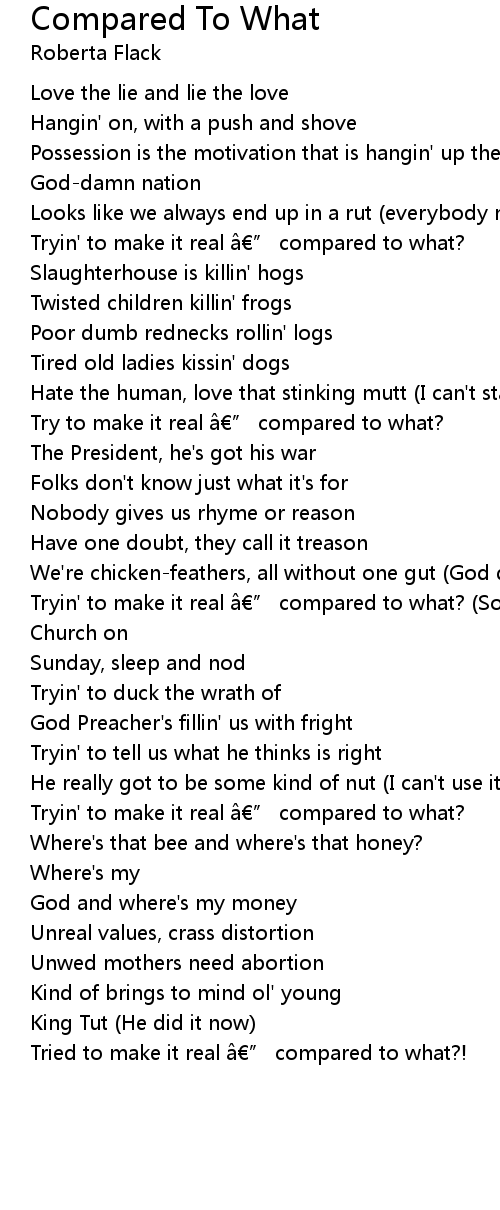 | Tryin' to make it real — compared to what? (Sock it to me, now) | |