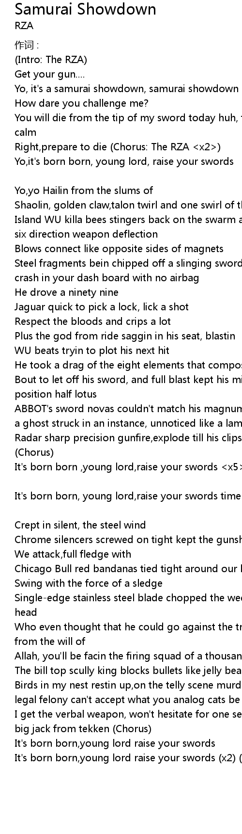 | It' s born born, young lord, raise your swords time for everyone to go record Verse 2: The RZA | |