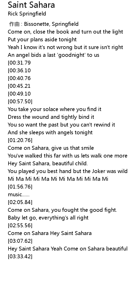 | [03:14.08] | Hey Saint Sahara Yeah Come on Sahara beautiful child |