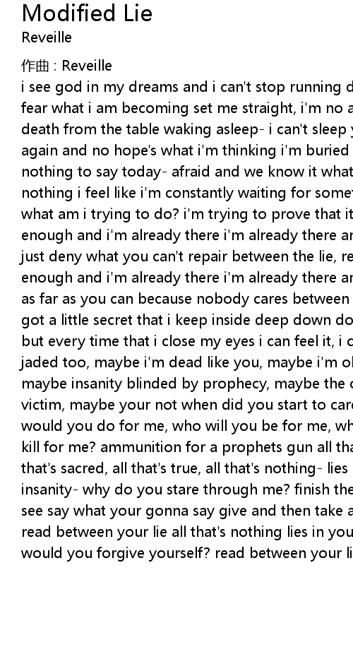| i see god in my dreams and i can' t stop running don' t care what i' ve become but fear what i am becoming set me straight, i' m no angel falling apart she feels death from the table waking asleep i can' t sleep yet i' m sleeping i' m slipping again and no hope' s what i' m thinking i' m buried alive inside, so claustrophobic nothing to say today afraid and we know it what do i know, i know that we know nothing i feel like i' m constantly waiting for something what am i waiting for, what am i trying to do? i' m trying to prove that it' s all a lie can' t get enough and i' m already there i' m already there and i still can' t get enough so just deny what you can' t repair between the lie, read between your lie can' t get enough and i' m already there i' m already there and i still can' t get enough run as far as you can because nobody cares between the lie, read between your lie i got a little secret that i keep inside deep down dormant in the dark she hides but every time that i close my eyes i can feel it, i can feel her die maybe i' m jaded too, maybe i' m dead like you, maybe i' m obsolete, maybe i' m incomplete, maybe insanity blinded by prophecy, maybe the opposite, maybe i' m right maybe a victim, maybe your not when did you start to care about what i thought? what would you do for me, who will you be for me, what about family, who would you kill for me? ammunition for a prophets gun all that' s become must unbecome all that' s sacred, all that' s true, all that' s nothing lies in you madness, insanity why do you stare through me? finish the rest of me see what you wanna see say what your gonna say give and then take away waiting for guilt to try and read between your lie all that' s nothing lies in you even if you' re forgiven, would you forgive yourself? read between your lie |